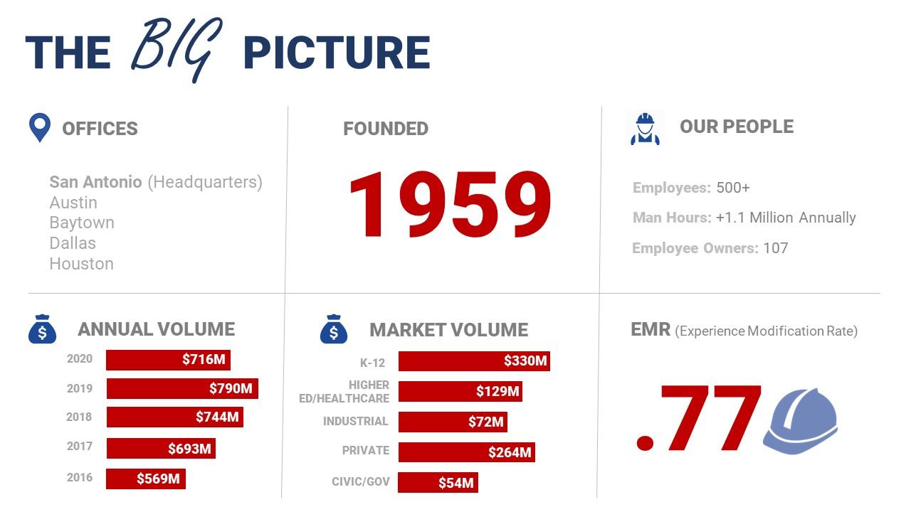 Our success is built upon the lasting partnerships we have established in San Antonio, many of which span decades. We are proud to have a collaborative forward-thinking and dynamic culture. We place considerable attention on creating an environment of teamwork and initiative. We are proud to offer a unique approach to the construction experience, one that puts our client's needs first.