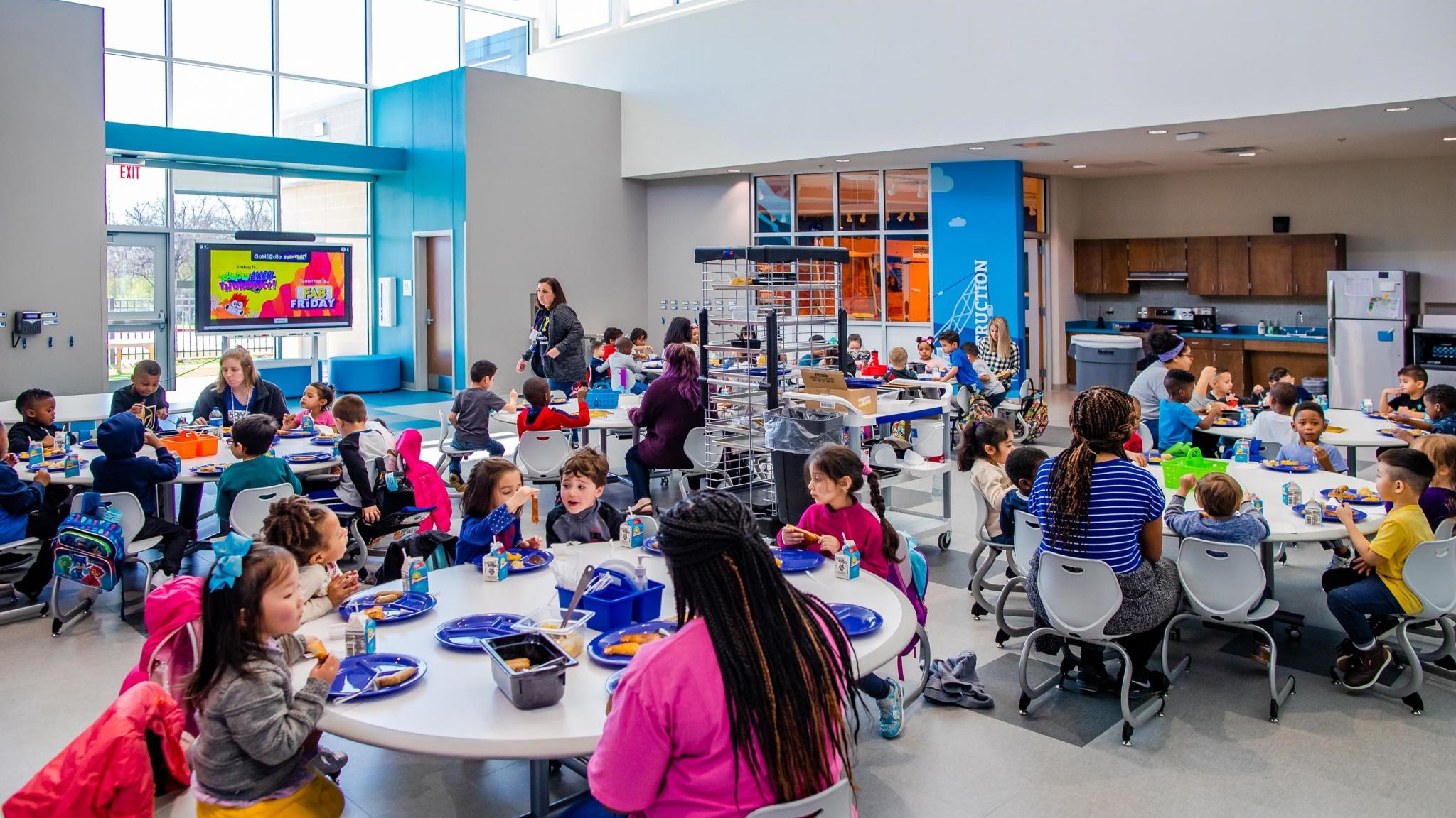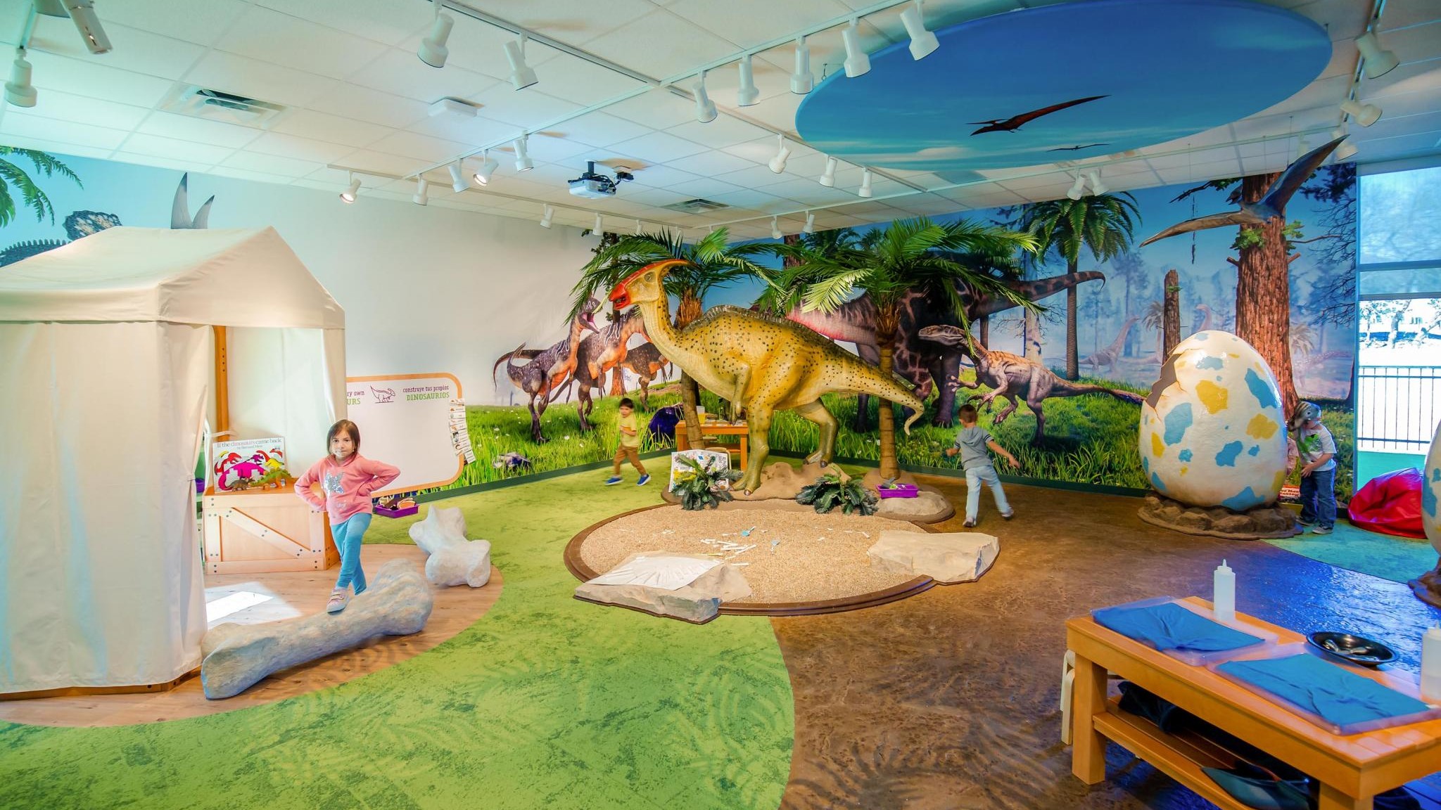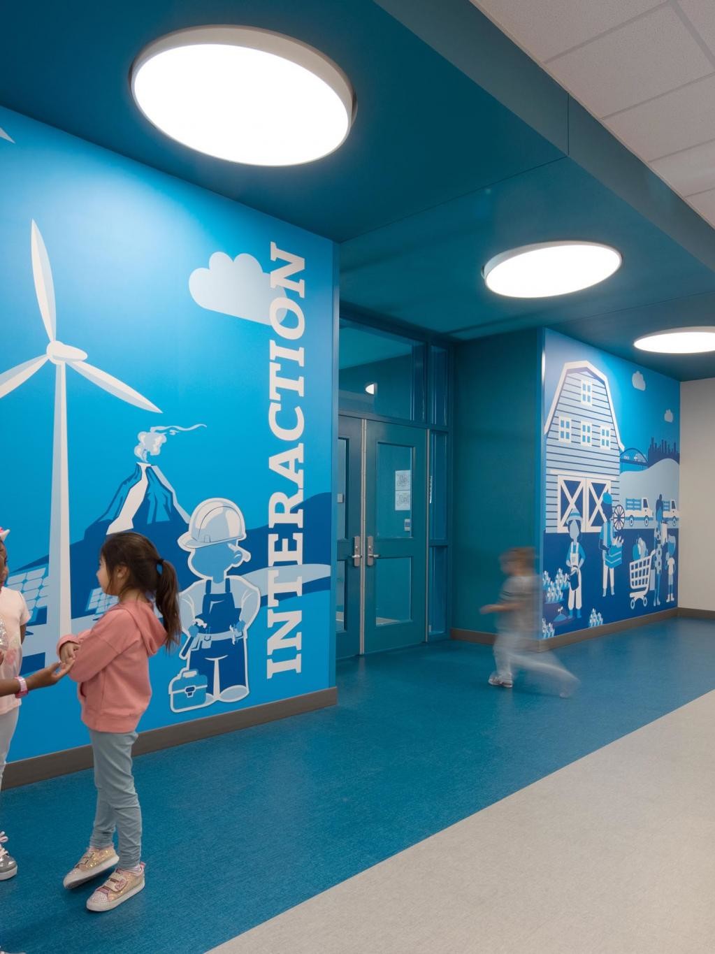 The 54,000 square-foot building resembles a hands-on children’s museum with dedicated themes that are carried out through décor and interactive exhibits. The learning environments are grouped into four main thematic pods and branch off into 16 distinct classroom environments. Students spend time exploring and learning about all aspects of life–from taking pets to the vet, igloos in the arctic, or how groceries make it to the shelves of a grocery store.