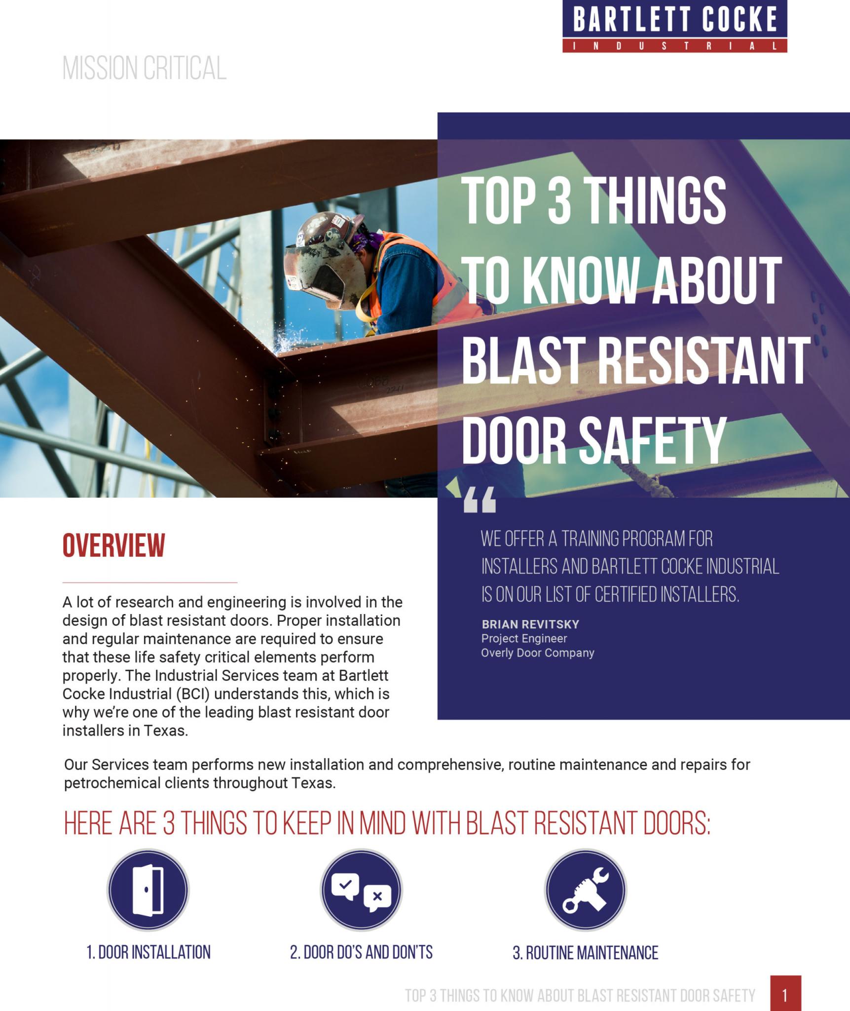 Bartlett Cocke Industrial is comprised of skilled Project Managers, Superintendents, Craftsmen, and Safety Personnel that are experts in addressing the needs of blast resistant door installation, as well as of the maintenance and repair of these doors.